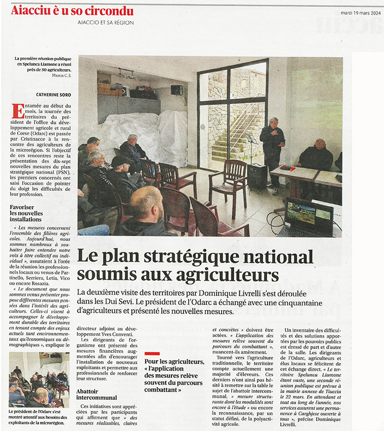 Dominique Livrelli, Président de l’ODARC se déplace dans toute la Corse en ce premier trimestre 2024, à la rencontre des élus du monde rural et des agriculteurs, afin d’échanger sur les enjeux de leur territoire en termes de développement agricole et rural et détailler comment les 17 mesures d’intervention du volet Corse de la nouvelle programmation 2023-2027 pourront les accompagner dans leurs projets.